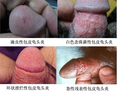 (1)急性浅表性包皮龟头炎:初起时局部潮红,阴茎的皮肤发红、肿胀,自觉龟头有灼热和瘙痒的感觉。翻开包皮,可见包皮内面及龟头充血糜烂,有渗液,甚至于出血。继发感染后可见小溃疡,有恶臭的乳白色脓性分泌物。如与内裤磨擦即感疼痛,患者常常活动不便。可伴有腹股沟淋巴结的肿大和压痛。