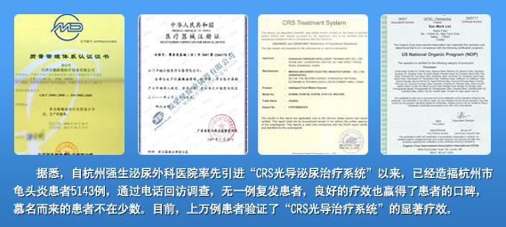 CRS光导泌尿治疗系统一面世就备受医疗机构和各国医疗界的瞩目和青睐,被乔治大学研究所、卫生组织等8大规范医疗机构联合承认。同时,CRS光导泌尿治疗系统还荣获7项领域规范医疗发明奖,并在、英国、德国、日本等30多个市申请了医学专利保护。