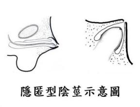 隐匿性阴茎尽管外形酷似包皮过长,但两者是完全不同的疾病。隐匿性阴茎是一种常见的先天发育异常和畸形疾病,阴茎缩至体内,凸出在外的只有尖尖的小包皮,如果用手将阴茎皮肤向内挤压,阴茎体就会显露,但手一放开,阴茎体就会缩回了。因此,也叫埋藏式阴茎。由于隐匿性阴茎也伴随包茎,所以,容易被误诊为包皮过长。